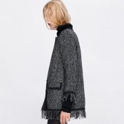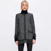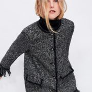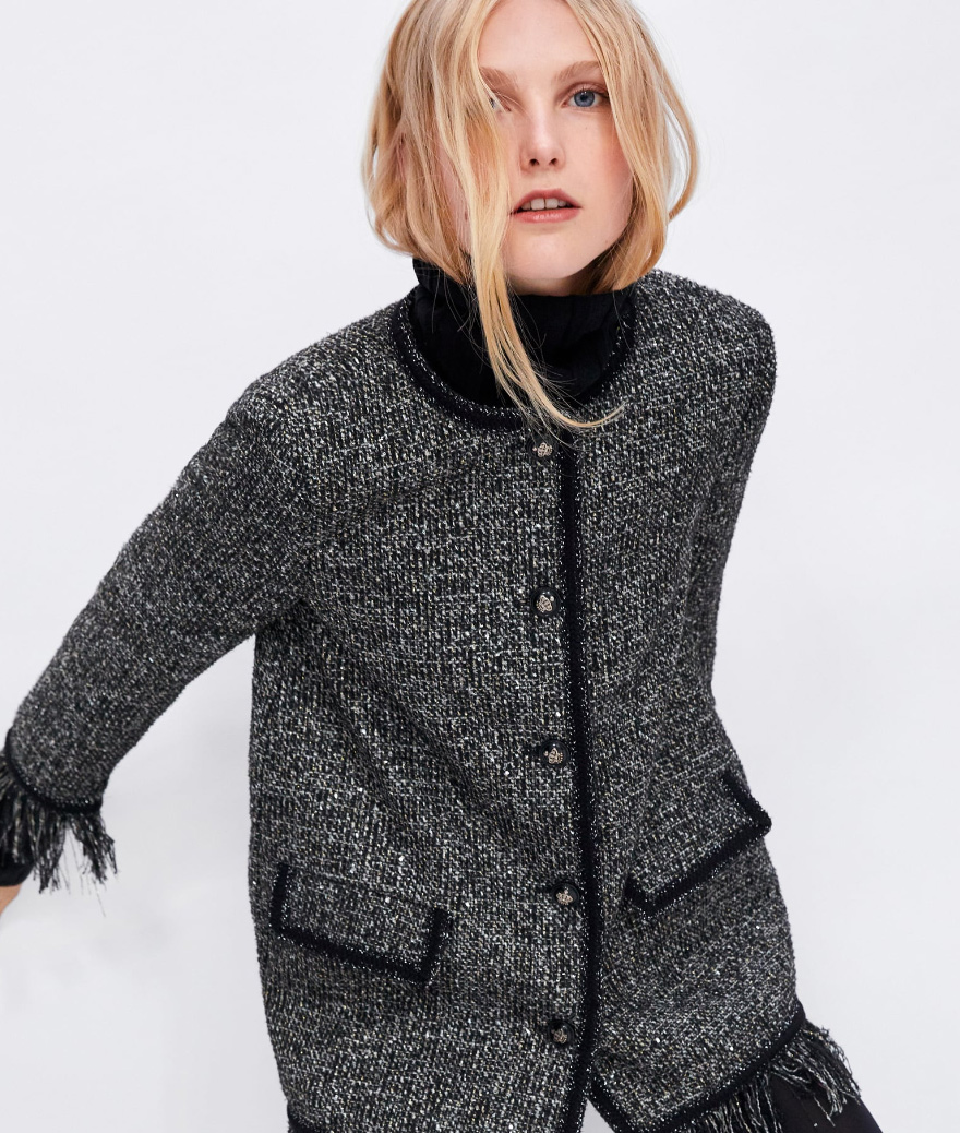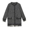 Round neck long-sleeved jacket. Front flap pockets. Frayed trim with contrasting piping. Front metal button closure.